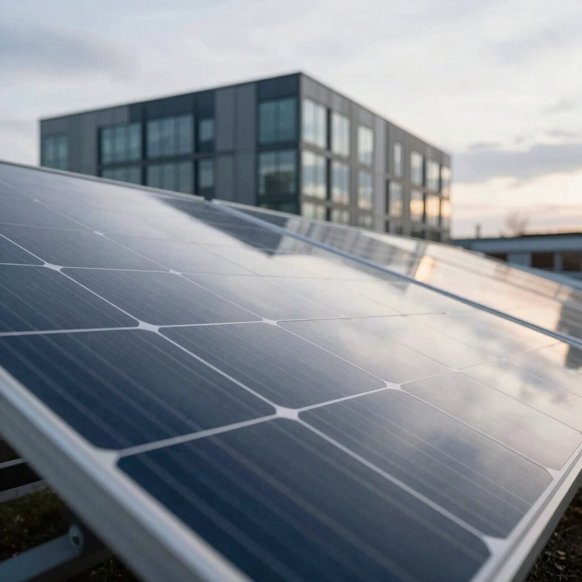 Close-up of modern solar panel arrays installed on a corporate rooftop in a Central European / German industrial park. The sky is a clear Pale Aqua, and the panels reflect a Medium Green sheen.